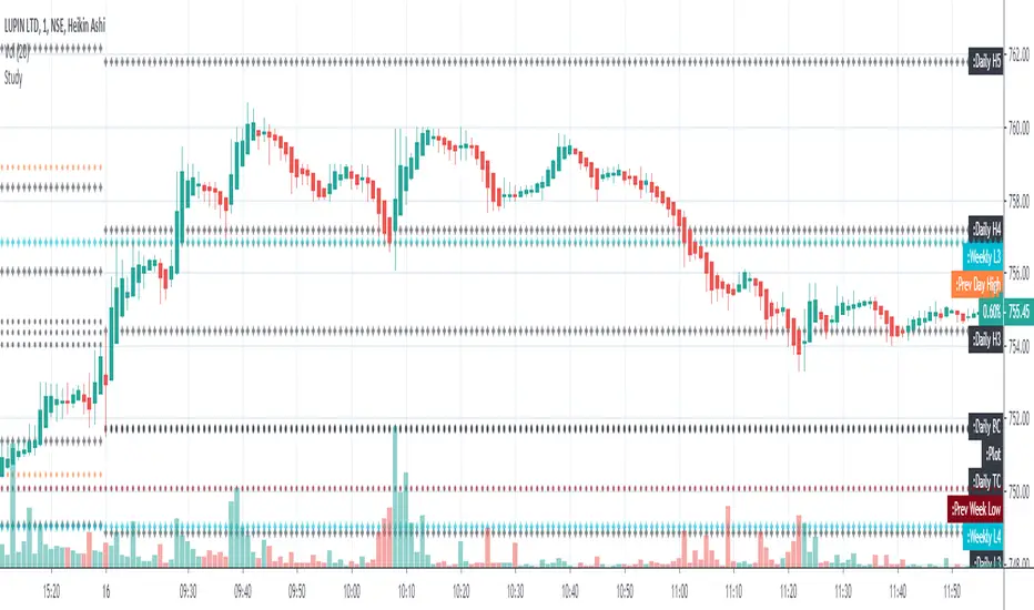 This script has CPR ranges for (Daily, Weekly, Monthly) and Major pivot levels for daily (R/S 3,4,5) weekly (R/S 3,4). It also has prev day H/L and weekly H/L.