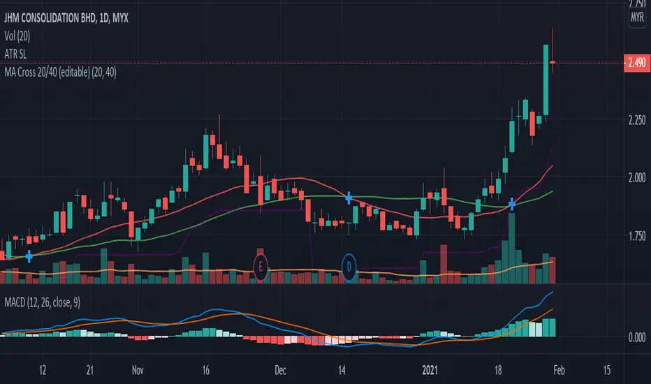 Simple script using the built in MA Cross script as the base but default to 20/40 MA and added option to edit the short and long duration values which the default script doesn't allow you to edit. My first script, it's yours for free. Be kind.