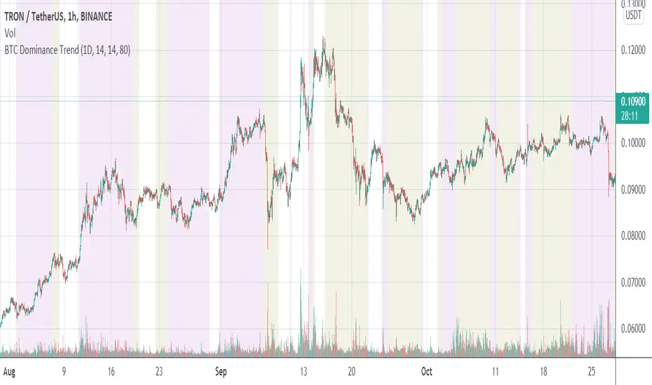This simple script applies the DMI/ADX (trend) indicator to the Bitcoin Dominance Index (BTC.D) to check whether BTC is increasing its dominance or not on that day. It is meant to be applied to altcoins on medium intervals. I put it together to test the following hypothesis: On days when BTC dominance is on the rise, altcoins are harder to take off, because Bitcoin is draining the lifeblood out of them, so caution is needed when opening trades.