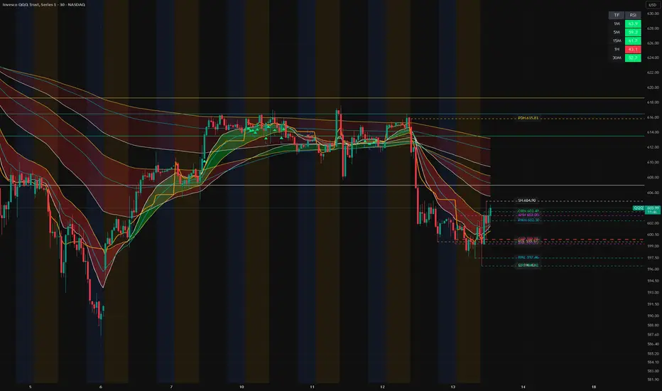 Built to spec as requested by a short-duration options trader that prioritizes LTF trends: this is the lite-version built on the premise of intraday directional structure, momentum conditions, and price-location relative to key references are aligned. Under the hood, it synthesizes a trend/structure layer derived from 3 tiers of EMA relationships, a momentum confirmation layer, and a session-based levels that auto-updates in real time (premarket/afterhours, opening boundaries, prior-day references, etc.). This comes with fully configurable inputs and styling controls for different instruments, chart themes, and operator preferences.