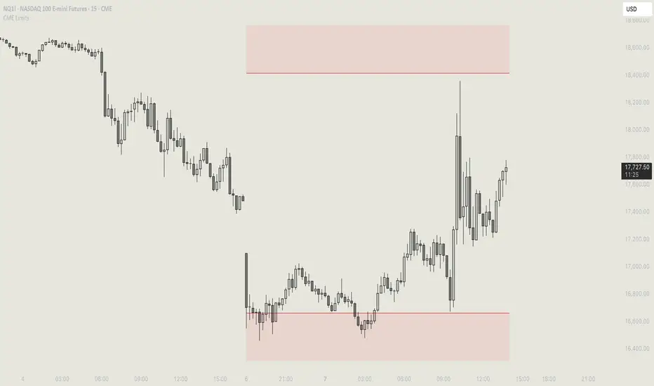 This indicator shows the CME Price Limit, combined with a safety distance that is used by several futures prop firms. Trading in the highlighted area means a rule violation for many Futures prop firm accounts.