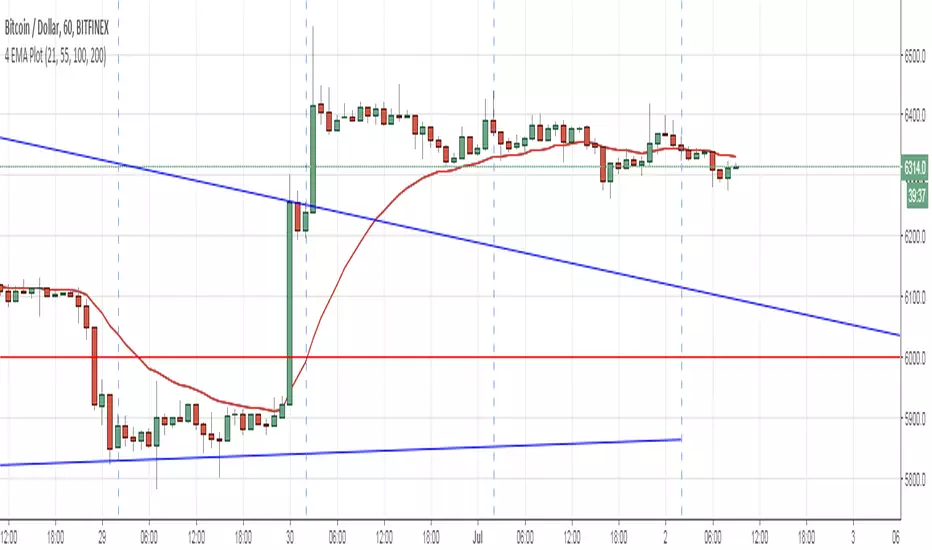 The script plots 4 separate custom Exponential Moving Averages on the chart as one indicator