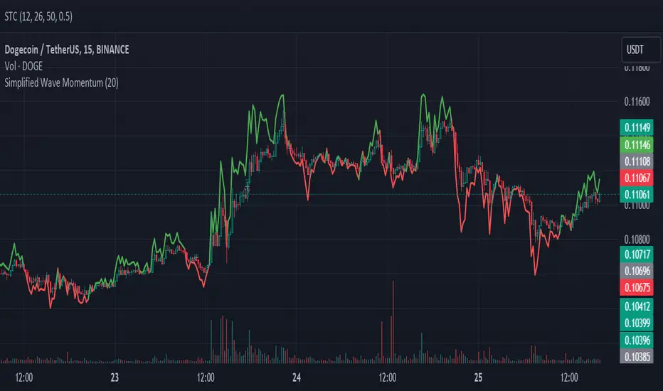 Purpose: This script identifies potential trend direction and momentum using a moving average and wave amplitude calculation. It shows a green line when the price is trending upwards and a red line when trending downwards.