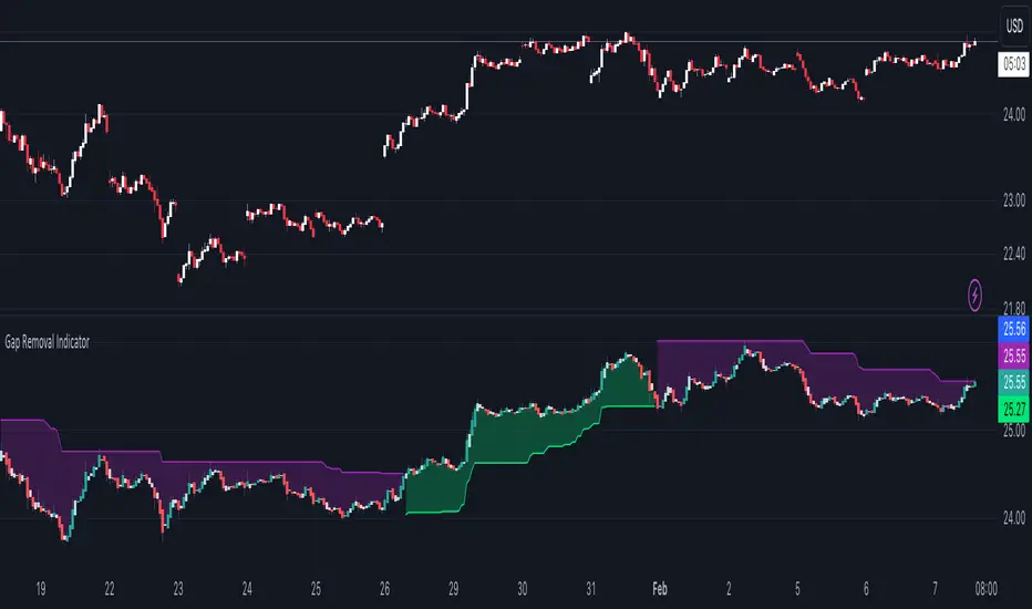 This gap indicator shows the price of your chosen instrument as if no gaps had occurred overnight. It can be especially useful on highly-volatile exchange-listed instruments that track other 24/7 assets, because the normal candlestick chart of these instruments will create a large amount of noise that may decrease the accuracy of your indicators or make the trend harder to see.