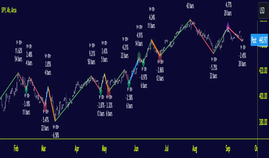 The script analyzes order flow based on fractal structure breaks. Every time there is a fractal breakout in the opposite direction of the dominant side in control a new leg ( bullish or bearish ) forms. This script comes with the added value of displaying the velocity and the magnitude of each leg/cycle.