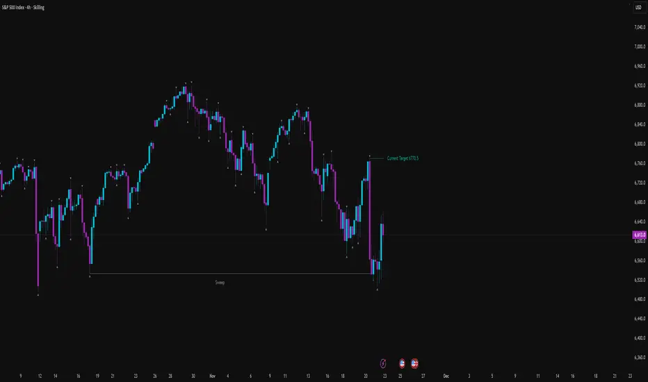 The indicator’s main use is on the 4-hour timeframe, where it detects the most recent sweep of a fractal level. After a sweep occurs, the script evaluates the next candle close to suggest the likely short-term momentum direction following that liquidity event.