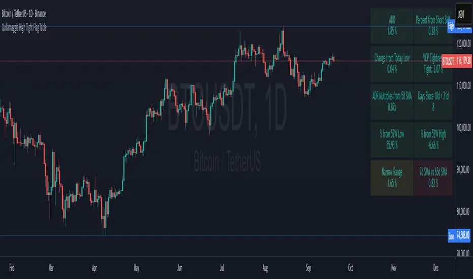 This indicator is a breakout scanner inspired by Qullamaggie's high-tight flag momentum strategy and Stockbee's Momentum Burst setups. It displays a 2x5 table of key technical metrics to identify high-probability long breakout opportunities in trending stocks or crypto on daily charts. The table highlights setups where a stock consolidates tightly after a strong uptrend, signaling potential volatility expansion for sharp upside moves. Green boxes indicate bullish conditions, while alerts notify traders of optimal setups or risks.