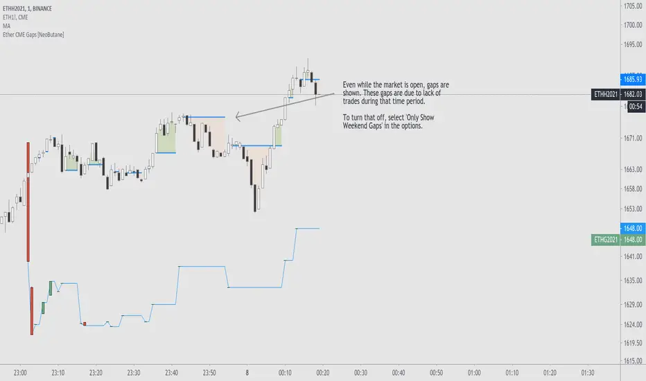 Detects gaps in trading for CME's "Ether" cash-settled futures. This will show gaps as they happen on the 24/7 charts that crypto exchanges use. It is not usable on CME's tickers themselves, as gaps in trading are not displayed.