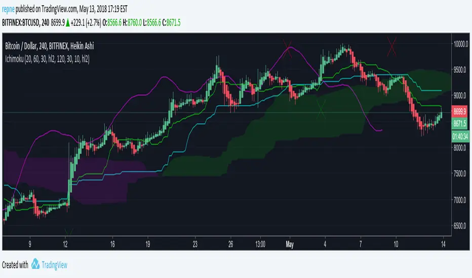 Classic Ichimoku Cloud with added configuration and support for Heikin Ashi candles. Smothing of the Chikou Span (Lagging Line) is on by default, the only purpose is to make the chart look cleaner. There's an added moving average (ZLEMA) and bear/bull crossings signals. Defaults are tuned for crypto, in particular BTC.