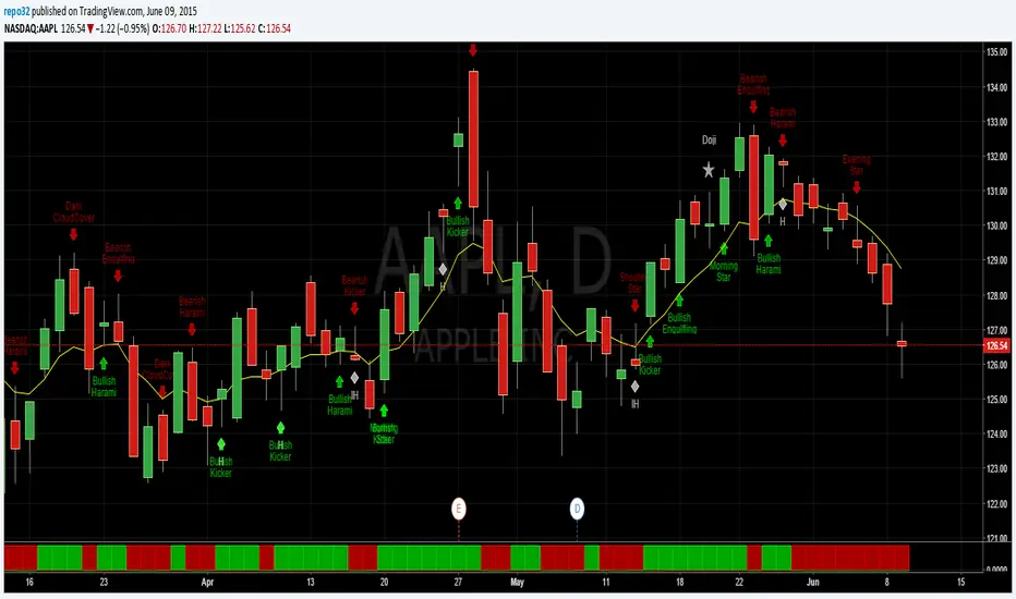 This script will give you red/green columns to indicate if price is above or below a certain EMA. With Candlestick charting, we are looking for price in relation to the 8 ema Trigger Line (T-Line). You can adjust this indicator to fit your need. Simple, but nice to quickly see.