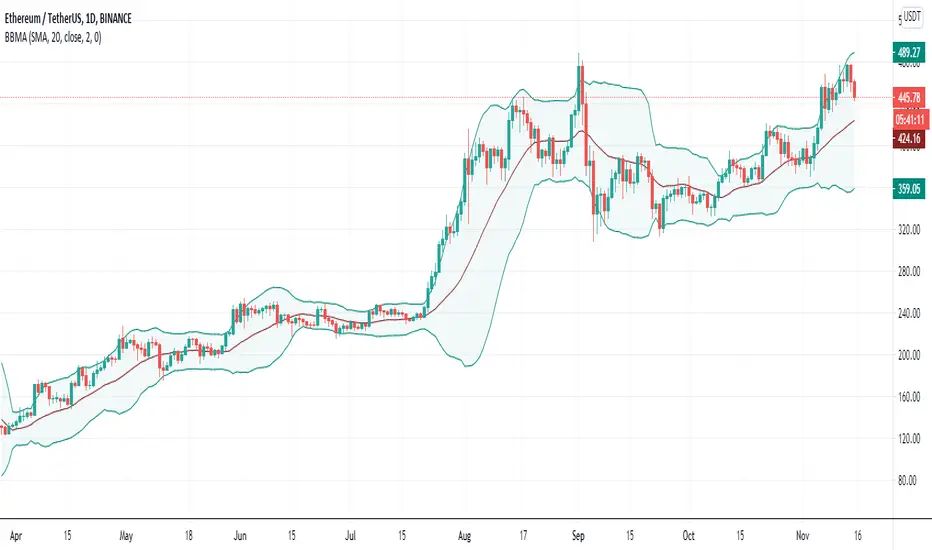 Bollinger Bands basically use SMA, here I revised it for use with many moving averages. Moving average types I have added: "EMA", "RMA", "SMA", "WMA", "VWMA", "WWMA", "TMA", "VAR", "ZLEMA", "TSF".