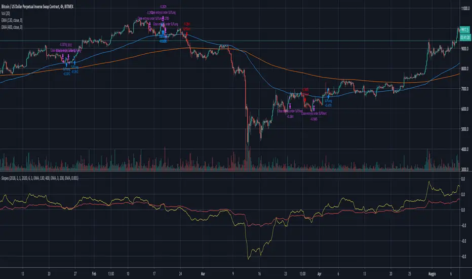 This strategy uses the cross of the slopes of two EMAs having different lengths to generate trend follower signals. By default, I use 130 and 400, which behave very well.