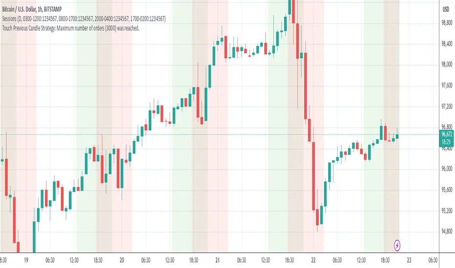 The Touch Previous Candle Strategy is a simple yet effective trading approach designed for the 1-hour chart. It focuses on price action by placing trades when the current candle interacts with key levels from the previous candle. The strategy is fully automated and includes risk management with take profit and stop loss levels.