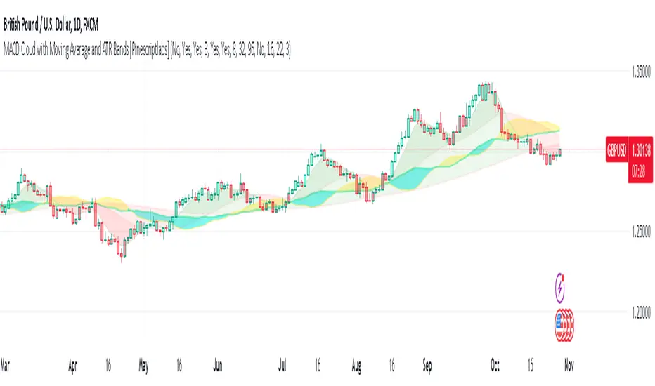 The algorithm implements a technical analysis indicator that combines the MACD Cloud, Moving Averages (MA), and volatility bands (ATR) to provide signals on market trends and potential reversal points. It is divided into several sections: