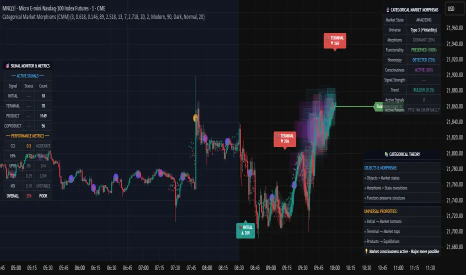 The Categorical Market Morphisms indicator applies advanced mathematical concepts to market analysis but does not guarantee profitable trades. Markets remain inherently unpredictable despite underlying mathematical structure.