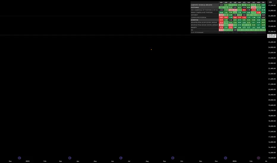 Multi-currency strength heatmap combining COT positioning and technical momentum across 10 major currencies (USD, EUR, JPY, GBP, AUD, NZD, CAD, CHF, MXN, BRL).