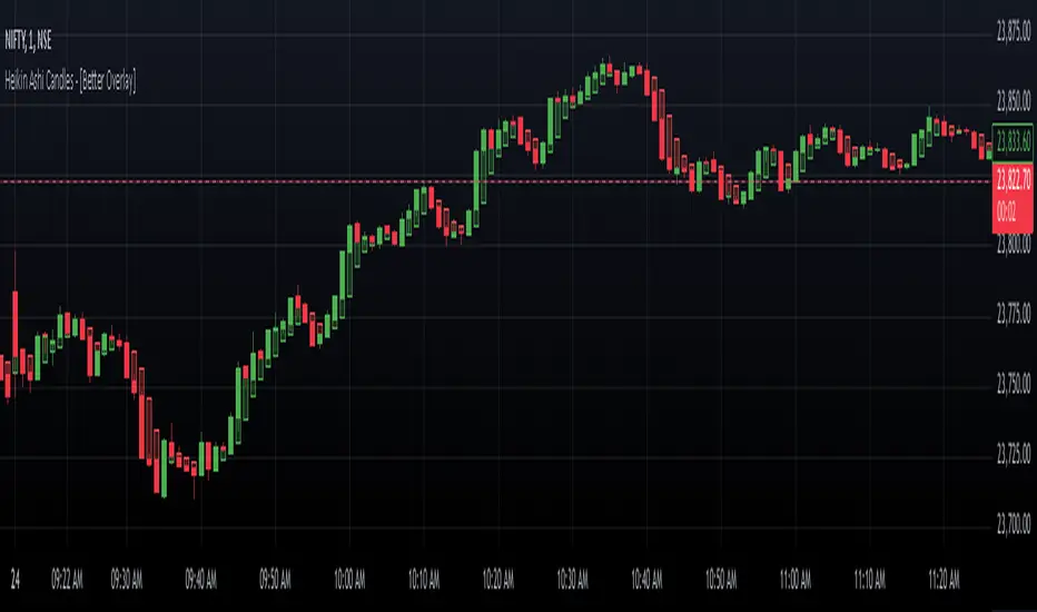 The "Heikin Ashi Candles - Better Overlay" indicator is a versatile tool for traders looking to combine the smoothing benefits of Heikin Ashi candles with the precision of real-time price data. Its additional features, like the Heikin Ashi moving average and dynamic price line, make it a comprehensive solution for both trend-following and real-time trading strategies.