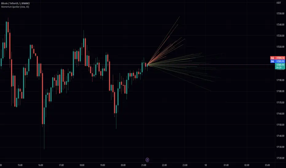 In this script, we will be creating an indicator called "Momentum Sparkler" that plots lines on the chart to visualize the momentum of the given source.