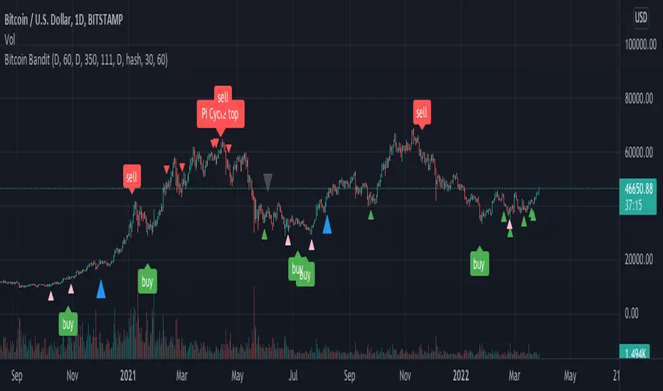 • Simply plug and play it to your chart. You can also connect TV alerts with a bot and let it run. Please be aware that SLIPPAGE time is important, If you run a bot on this indicator you HAVE to know that the buy/sell price will be on the bar AFTER the Candle close (For example: the BUY/SELL alert is on a candle, the buy/sell your bot or you will execute WILL be in the following candle depending on your trading system. Bitcoin Bandit only works on the Daily timeframe on the BTCUSD trading pair. Please contact us if you do not understand how to use it.