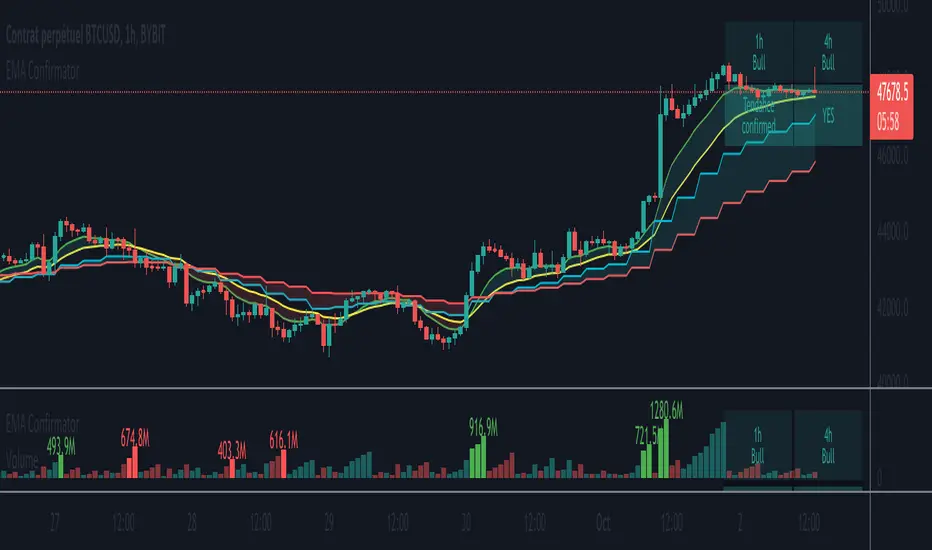 Shows if the cross of 2 EMAs is bullish or bearish and confirms with the cross of 2 others EMAs from the next upper timeframe.