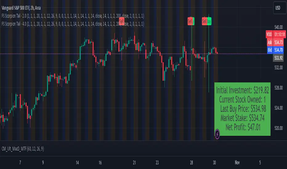 This software is a custom trading strategy indicator called FS Scorpion Tail built on Pine Script (version 5). It provides a sophisticated framework for generating buy and sell signals using a combination of technical analysis indicators like EMA, MACD, RSI, Aroon, ATR, and Bollinger Bands. The software also tracks cash flow metrics such as market stake, initial investment, and net profit, and provides visualization on the chart through buy/sell signals and custom labels.Key Features & Components: