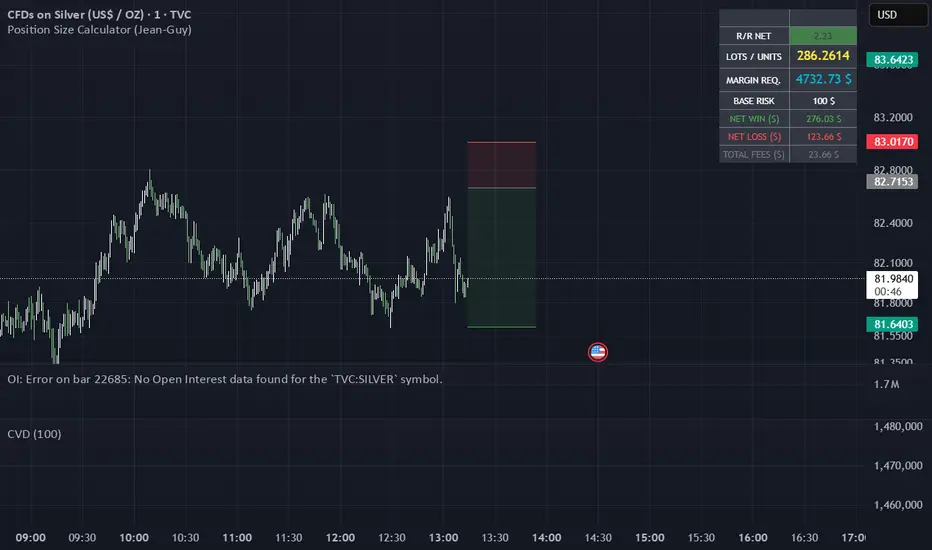 Key Features • True Net R/R & P&L: Automatically calculates your Reward/Risk ratio and Profit/Loss by subtracting entry and exit fees. • Dual Risk Management: Choose to risk a fixed dollar amount ($) or a precise percentage (%) of your total bag. • Execution HUD: A clean table in the top-right corner displays Margin Required, Leverage, and Net Outcomes. • Optimized UI: Includes a "Safety Margin" row at the top to prevent TradingView's hover menu from hiding your R/R data. • High-Visibility Visuals: 90% opacity zones for entry/SL/TP to help you align with your market structure.