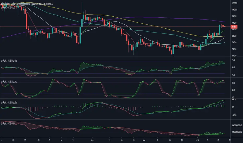 Marsie is an EMA-RSI indicator and part of the 'keeping it simple' series that have a similar color scheme. The RSI 'Relative Strength Index' is a momentum oscillator, measuring the velocity and magnitude of directional price movements. it is measured from 0 - 100 with 30 and 70 being low "oversold" and high "overbought" conditions. It is also commonly used to determine bullish or bearish divergences.
