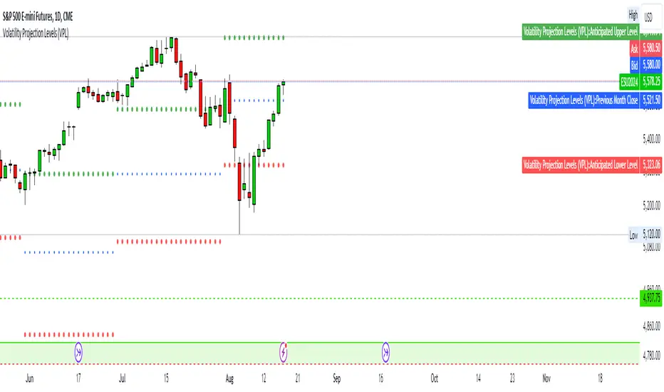 The **Volatility Projection Levels (VPL)** indicator is a powerful tool designed to help traders anticipate key support and resistance levels for the E-mini S&P 500 (ES) by leveraging the CBOE Volatility Index (^VIX). This indicator utilizes historical volatility data to project potential price movements for the upcoming month, offering clear visual cues that enhance swing trading strategies.