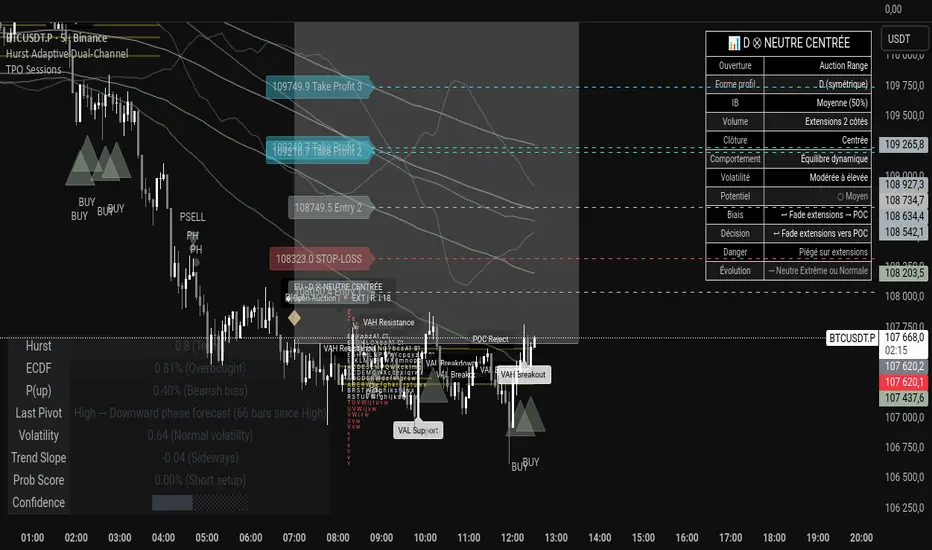 This indicator enhances the previous “Dual-Channel + ECDF Reentry” model by introducing Hurst-adaptive channel lengths.Instead of using fixed lookback periods, the short and medium channels now dynamically expand or contract according to a real-time estimate of the Hurst exponent, a measure of the market’s fractal persistence.
