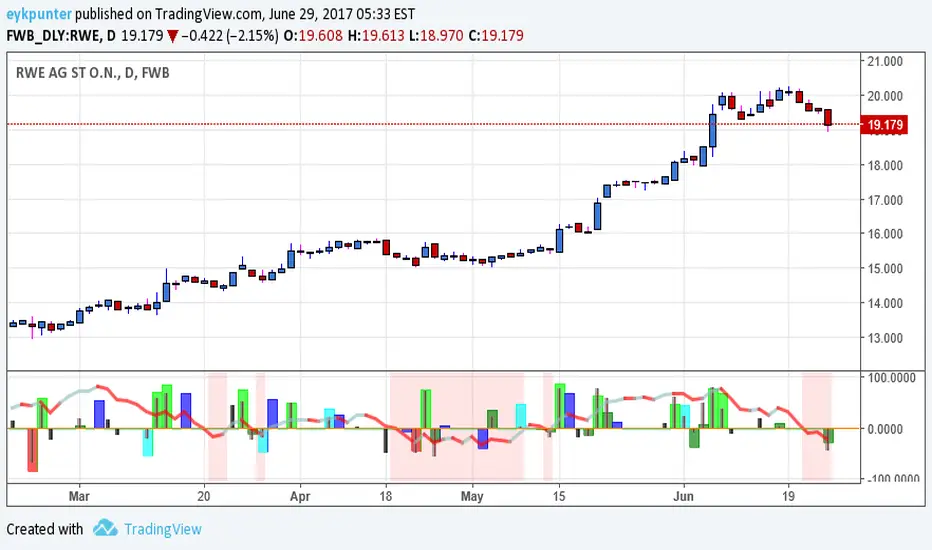 Changes in the feelings (positive, negative, neutral) in the market concerning the valuation of an instrument are often preceded with sudden outbursts of buying and selling frenzies. The aim of this indicator is to report such outbursts. We can see them as expansions of volume, sometimes 10 times more than usual. and as extensions of the trading range, also sometimes 10 times more than usual (e.g. usual range is 10 cent suddenly a whole dollar.) The changes are calculated in such a way that these fit between plus and minus 100 percent, the bars are scaled in some sort of logarithmic way. The Emoline is the same as the one in the True Balance of Power indicator, which I already published