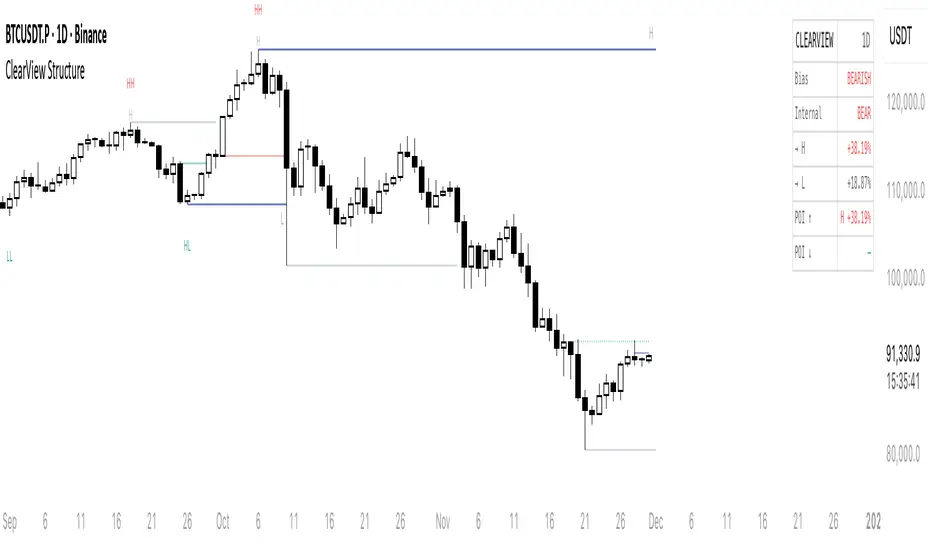 ClearView Structure is a comprehensive market structure indicator that identifies key swing points, structural breaks, and imbalance zones in real-time.
