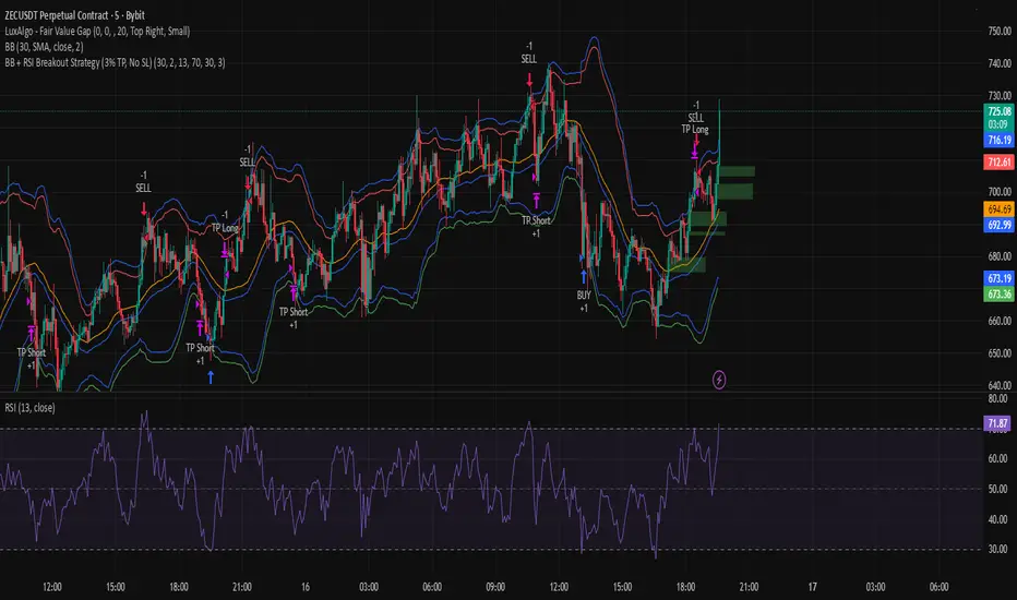 This BB + RSI Breakout indicator is designed to help traders identify potential buy and sell opportunities based on price movements relative to the Donchian channel (or Bollinger-type channel) and momentum conditions. It calculates the highest high and lowest low over a user-defined length to form a dynamic channel, and then it checks whether the current price breaks above the upper band (for a buy signal) or below the lower band (for a sell signal). To avoid repeated signals in a row, the indicator uses a state system: after a buy signal occurs, it will not generate another buy until a sell occurs, and vice versa. When a buy signal is triggered, it automatically calculates a take-profit price a certain percentage above the buy candle and displays this price below the candle as a “TP” label. Sell signals are displayed above the candle, and any previous TP label is cleared. The indicator updates in real time, so the signals move with the chart, giving a clear and lag-free visualization of entry points and potential profit targets.