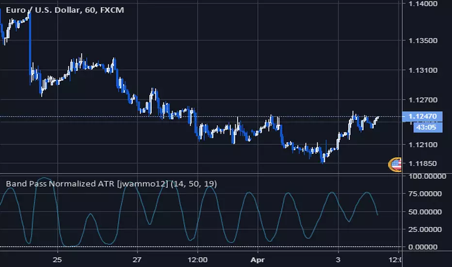 This script uses band passes to normalize Average True Range. A high band pass is used to remove signals greater than the wave_duration period. a low band pass is used to remove signals smaller than the lowerband input