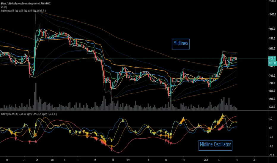 Historical high/low/midlines overlay price action, showing how the "Midline Oscillator" works.
