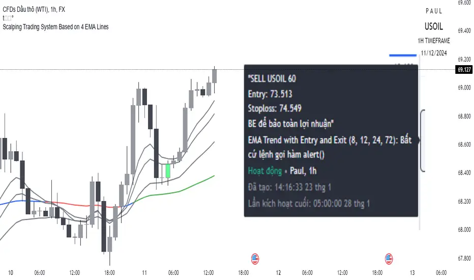 This is a scalping trading strategy built on signals from 4 EMA moving averages: EMA(8), EMA(12), EMA(24) and EMA(72).