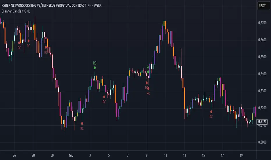 The "Scanner Candle v.2.01" is an indicator classifies candles based on the body/range ratio: indecisive (small body, ≤50%), decisive (medium body), explosive (large body, ≥70%). It includes EMAs to identify trends and "Reset Candles" (RC), small-bodied candles near EMAs, signaling potential reversals or continuations. Useful for analyzing volatility, breakouts, reversals, and risk management.