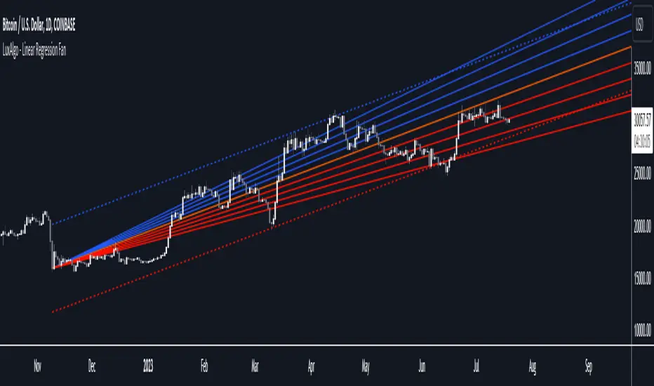 This indicator displays a fan using a linear regression fit to the price as a base. All lines are equidistant and are drawn from the first point of the linear regression to the most recent point of the linear regression plus the root-mean-square deviation (RMSD) multiplied by a certain factor.