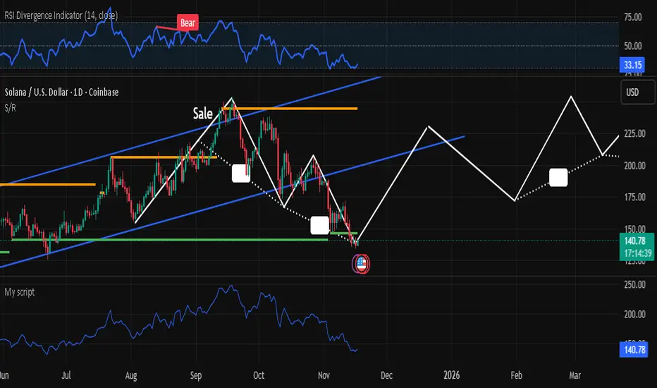 Solana is currently holding around $140 after a sharp correction from the upper channel resistance. Price is testing a key ascending trendline and horizontal support zone near $135.