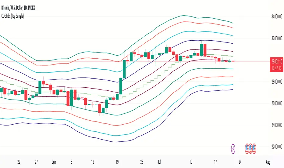 This script, named "COG Fibs [LazyBear]", is a custom TradingView script that uses the centre of gravity (COG) concept and Fibonacci multipliers to generate a series of potential support and resistance bands around a midpoint moving average.
