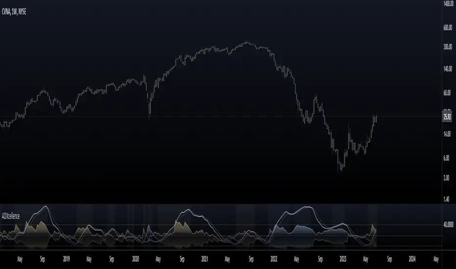 - The ADXcellence Indicator also offers a unique feature of dynamically adjusting the fill between DI+ and DI-, with the color and fill intensity changing based on the relative value of the two.