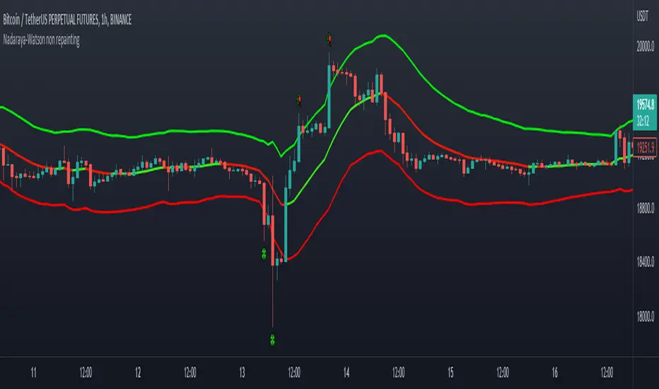 El problema de los maravillosos indicadores de Nadaraya-Watson es que repintan, jdehorty hizo una aproximación delNadaraya-Watson Estimator usando un Kernel cuadrático racional, así que usé este indicador como inspiración [url=