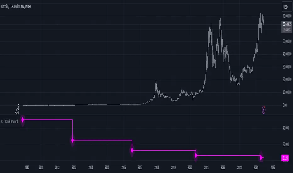 Even though this is a very simple indicator, I'm currently missing a data source to compute the Block Reward value within Tradingview. Therefore, I created this indicator and its associated library function to enable its visualization and (eventually) for coders to make use of the source function to power more elaborate scripts related to the Halving Events.