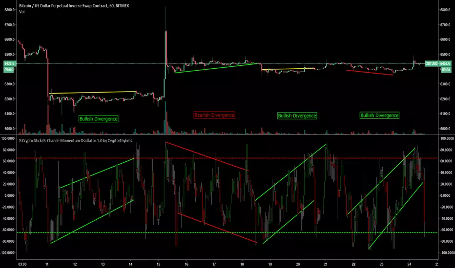 I have found this indicator to show nice divergences as shown on the main chart. Even in this nightmarish sideways bitcoin movement, it still is giving decent divergence signals! It also gives a signaling system to CMO implementing overbought and oversold zones. This indicator is freely available for anyone from the public library.