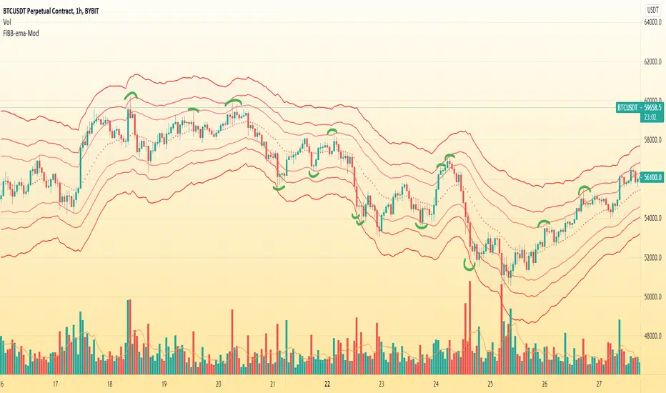 This is a modified Bollinger bands that uses EMA,with ATH to get a main average and then takes Standard Deviations by Fib ratios outwards. It is very useful for Entries and exits. I Typically use it to exit longs or shorts, entries are a bit harder. Generally the price will wick just barely or briefly into the end of one of the bands and then leave, it PINGs it and that is your exit. It is a little hard to predict in real time and set a Take profit at any exact point because it is always moving, but because it constantly adjust it is pretty damn accurate at nailing it. They sorta work at any timeframe, so its up to you, though for Crypto it doesnt do so well above 4hr because it can pump really hard or dump hard and super stretch the bands. Best numbers for the Average are Fib numbers. Stick to using 13, 21, and 34. 34 is my favorite and works best for me, But its up to you. Sometimes its benificial to use 34 on lower timeframes and maybe a smaller number on larger ones IE 21 or 2 or 4hr charts.