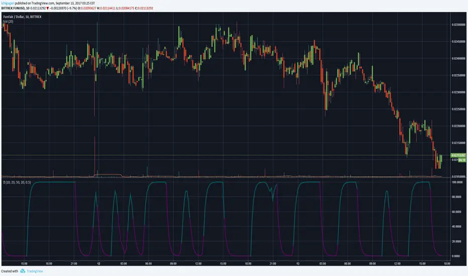 A slightly modified Schaff Trend Cycle-like indicator that detects trends before standard MACD and STC. High values (near 100) indicate imminent break down, whereas low values (near 0) indicate imminent movement upwards. This should be used for coins/symbols that are currently cycling. You'll want to experiment with different time intervals (15/30/60 min charts) to get the best results for a specific currency.