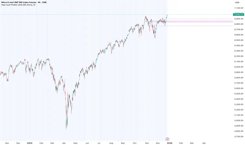 This indicator automatically detects and plots 4-hour gap zones on any chart timeframe. Gaps are price discontinuities where one 4H candle's low is above the previous 4H candle's high (gap up) or where one 4H candle's high is below the previous 4H candle's low (gap down). These levels often act as key support/resistance zones.