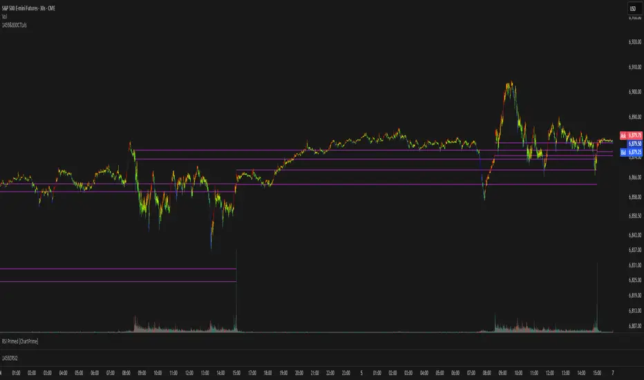 This indicator draws a line from the high and low of the 30 second candle at 14:59:30CT, and extends the lines for 24 hours.