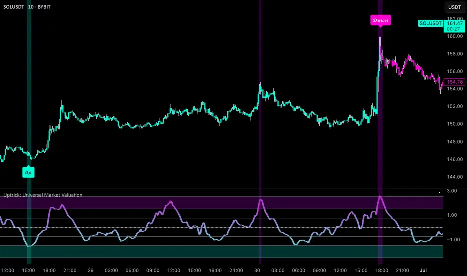 Uptrick: Universal Market Valuation is created for traders who seek an analytical tool that brings together multiple signals in one place. Whether you focus on intraday scalping or long-term portfolio management, the indicator merges various well-known technical indicators to help gauge potential overvaluation, undervaluation, and trend direction. It is engineered to highlight different market dimensions, from immediate price momentum to extended cyclical trends.