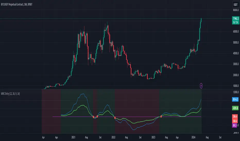 Entry Points Indication: The indicator uses red dots to mark the points where the average line crosses over or under the MACD or RSI lines. These intersections are meant to signal potential entry points for traders.