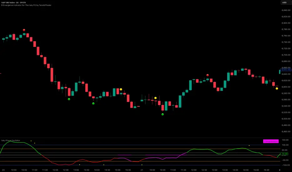 This tool is designed to automatically detect regular and hidden divergences on price using data sourced from The Saty Phase Oscillator. Divergences are displayed directly on the chart using a simple traffic-light visual system: